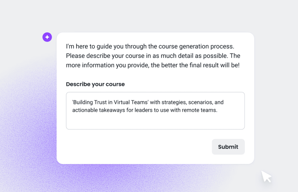 Show them how fast it is. Instead of writing long docs, they can upload materials and watch them turn into interactive eLearning courses with interactive features like quizzes and branching scenarios.
