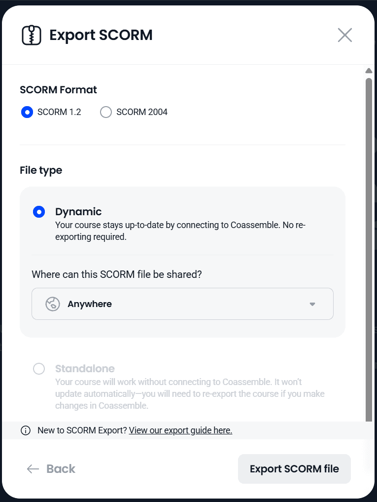 Use SCORM 1.2 if you’re unsure. It works with nearly every LMS. Choose SCORM 2004 only if you need advanced sequencing or deeper tracking.