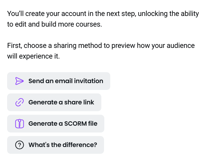 Creating a free account unlocks full access to the platform. No credit card, no hidden limits. This also ensures your SCORM package keeps working wherever you upload it.