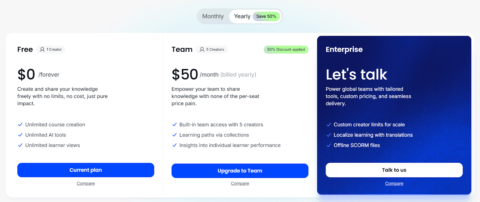 Your free plan includes unlimited course creation, access to all AI tools, and unlimited learner views.