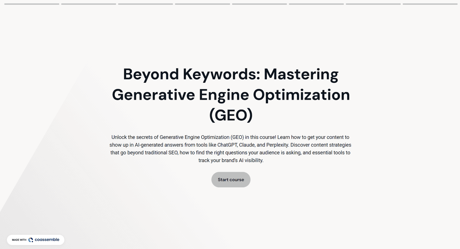 Take this sample course about Generative Engine Optimization (GEO). Built using Coassemble from a simple Google Drive deck, it was transformed into a branded, trackable course in minutes.