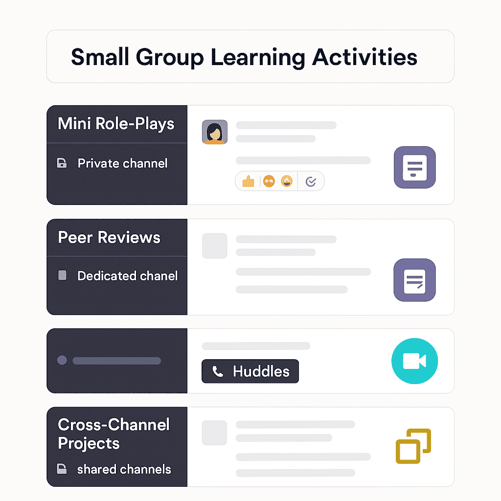 - Mini role-plays: In a private channel, one person facilitates a scenario while peers give feedback in a thread.