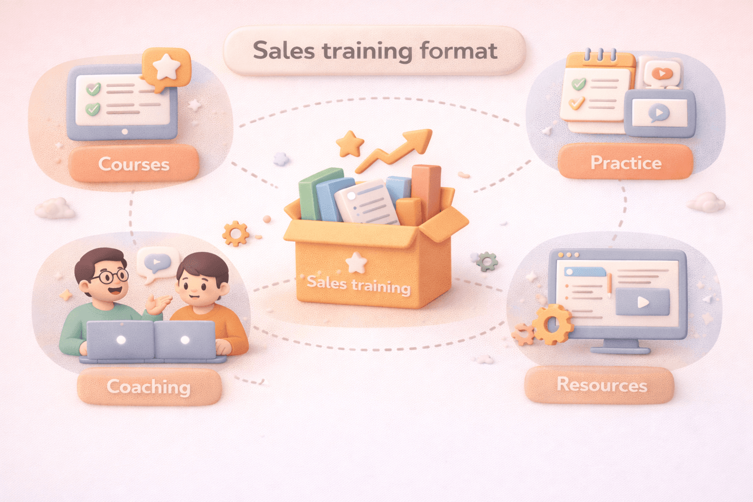 A sales training format is how sales training is structured and delivered to the sales team. It defines how sales reps learn, practice, and revisit key sales skills.
