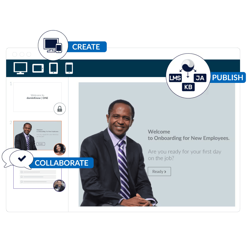 DominKnow | ONE is a centralized course creation tool that helps teams create eLearning content once and deliver it everywhere: training, support portals, or knowledge bases. Designed for modern workforces, it blends powerful authoring with multi-channel publishing to make interactive training available on any device.