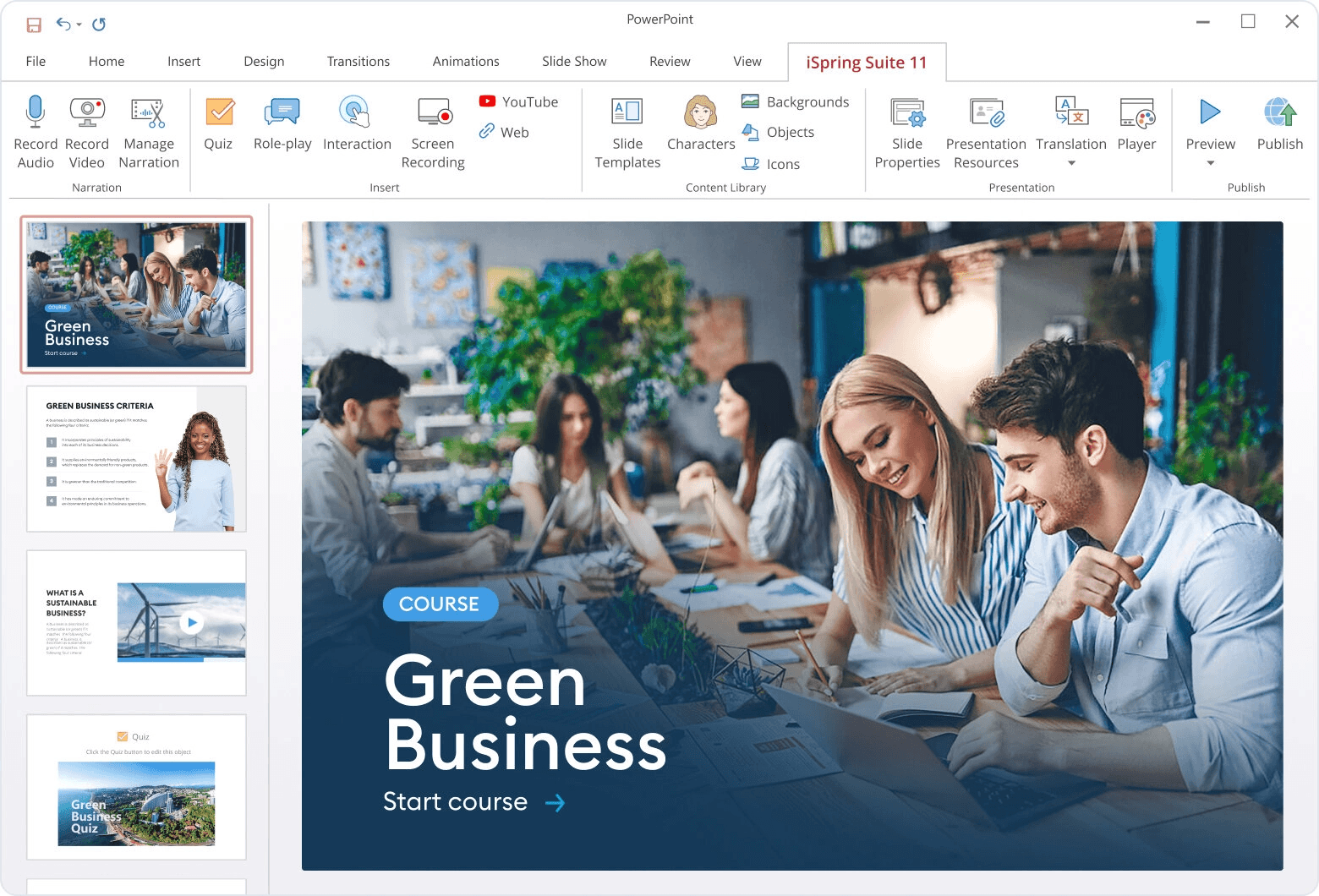iSpring Suite turns PowerPoint into a complete course creation tool for building professional, SCORM-ready interactive training. It’s built for trainers and instructional designers who need to create courses quickly without learning a new interface.